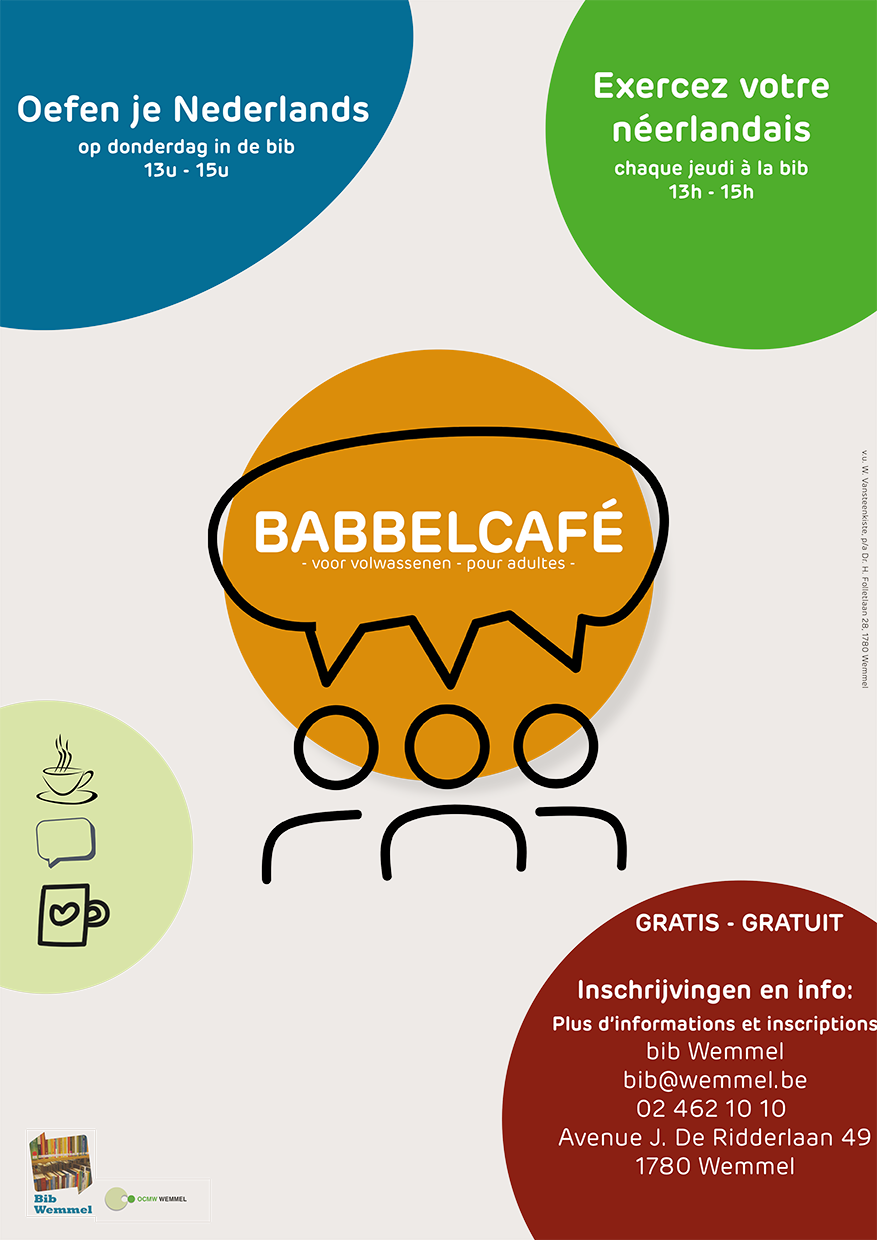 Babbelcafé is een praatgroep of conversatietafel waar je Nederlands spreekt en oefent met elkaar. Babbelcafé vindt elke donderdagnamiddag* plaats van 13u-15u in de bibliotheek van Wemmel (J. De Ridderlaan 49).